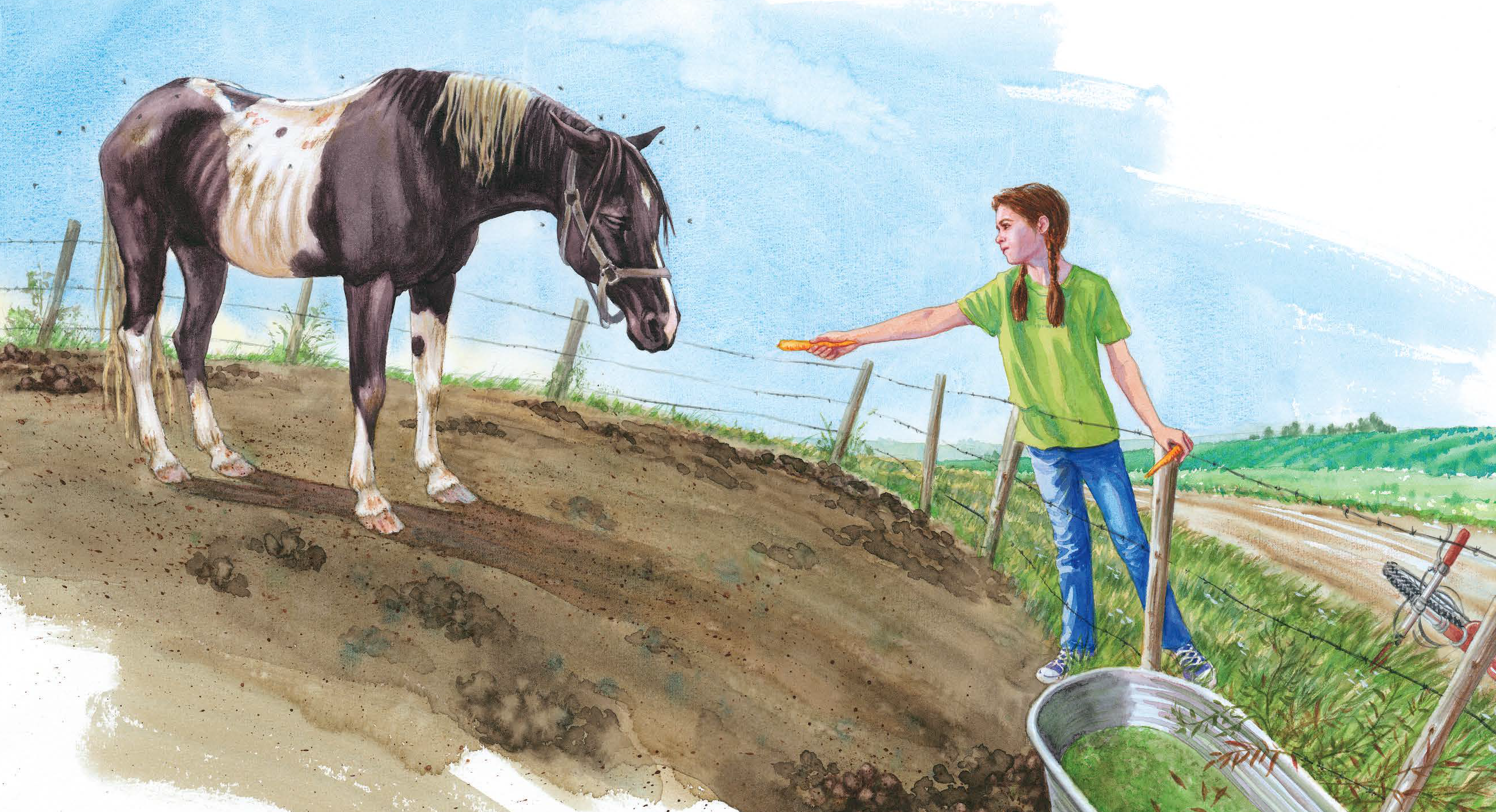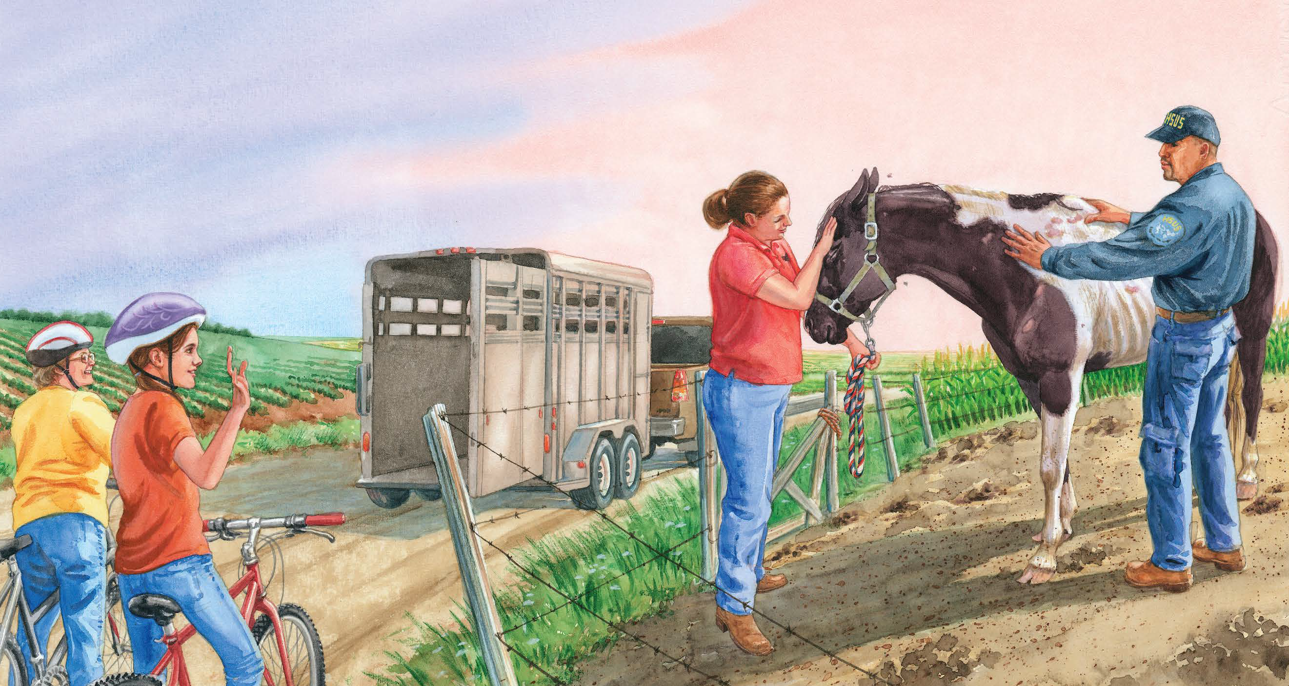 Call the Horse Lucky presents the issue of horse neglect in simple, straightforward language and compelling illustrations that enable young readers to identify with the girl, Mel, and the horse, Lucky. When visiting her grandmother, Mel discovers a neglected horse. Moved by the sight of his sad, glazed eyes and protruding ribs, Mel initiates a rescue; the horse is transported to a rescue ranch, where Mel learns about horse care. She comes to realize that since she lives in town and her family can’t afford the expense of a horse, she can’t adopt Lucky. When Lucky recovers and moves to a horse therapy ranch, Mel is thrilled that she can volunteer there and continue to bond with the horse she helped save.