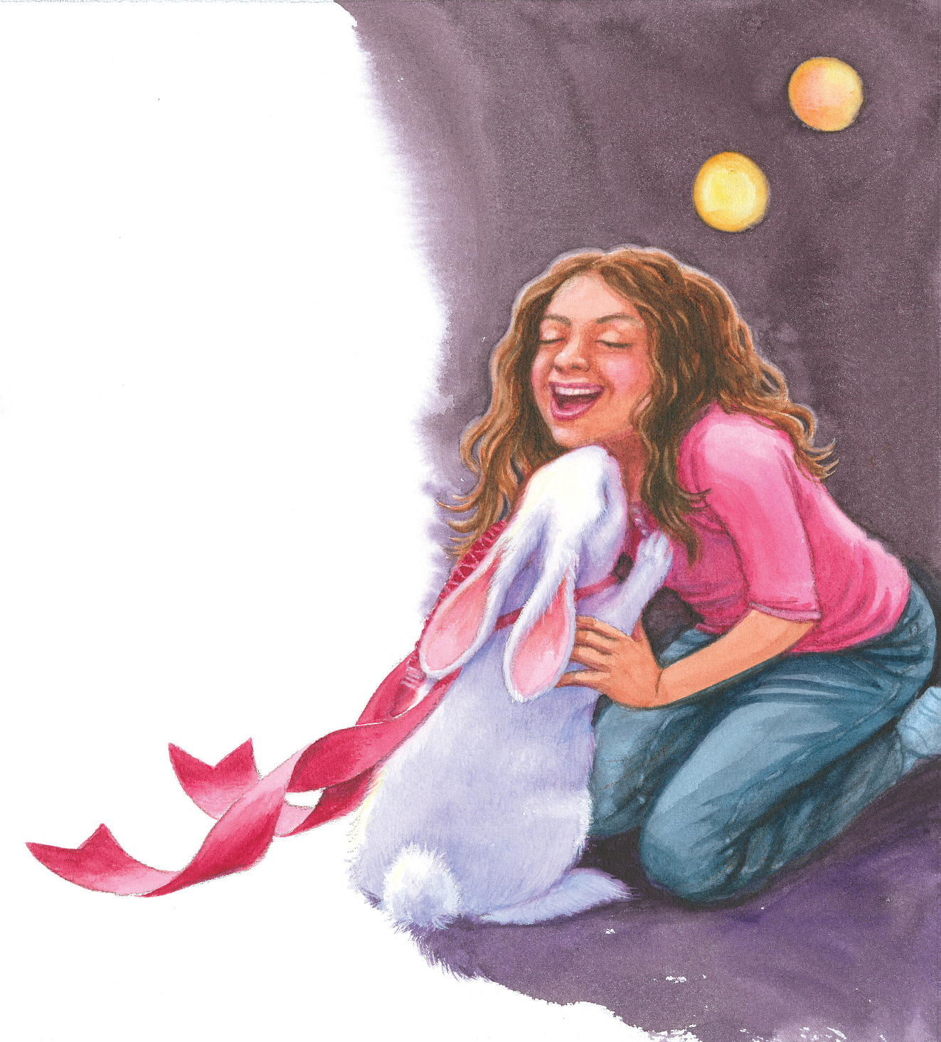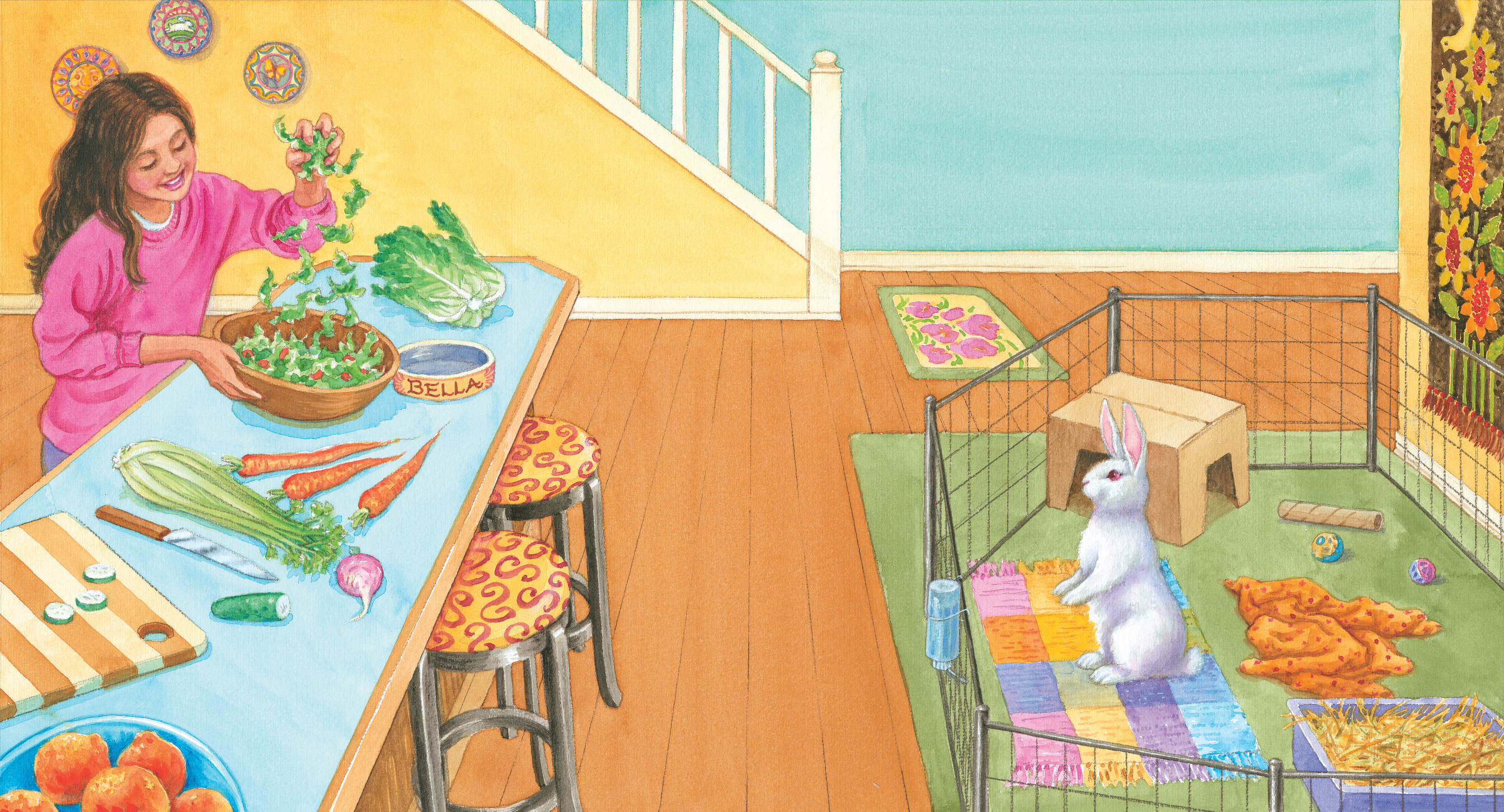 Eventually the shivering, hungry rabbit is given to Rosalita, who names her Bella: She whispered in my ear … that I would never be caged outside again. Girl and rabbit bond during agility exercises and Bella leaps for joy at having a forever home.
