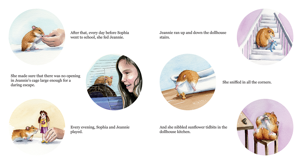 ... With an interesting layout of full and partial illustrations, this sweet picture book entertains, especially on the pages that depict Sophia hunting the missing hamster down. A friendship between Sophia and the mischievous pet is inevitable as she discovers the commonalities between Jeannie's small world and her own miniature playhouse.